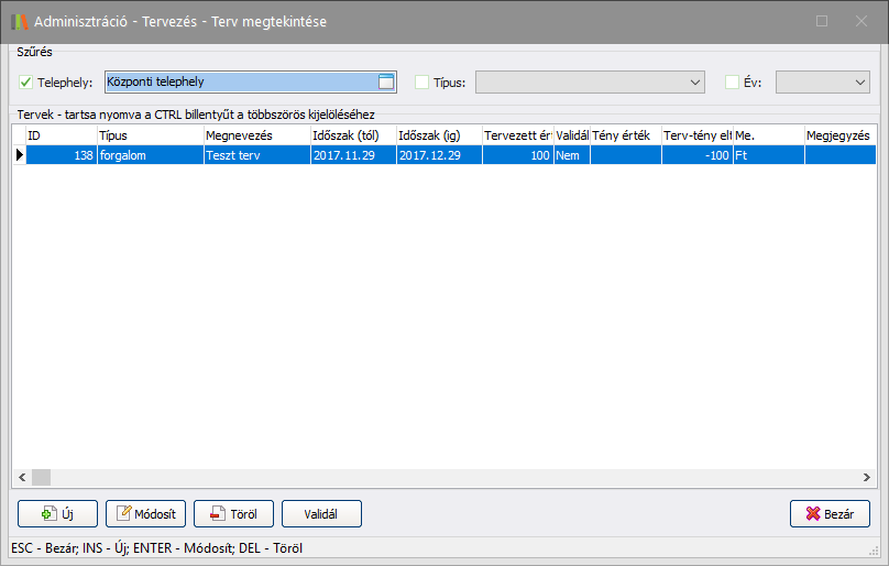 Fontos! Validált és rögzített terv utólagos módosítására nincs lehetőség! Amennyiben a terv bármilyen részletét (dátum intervallum, telephely, stb.) szeretné módosítani, úgy azt a listában a