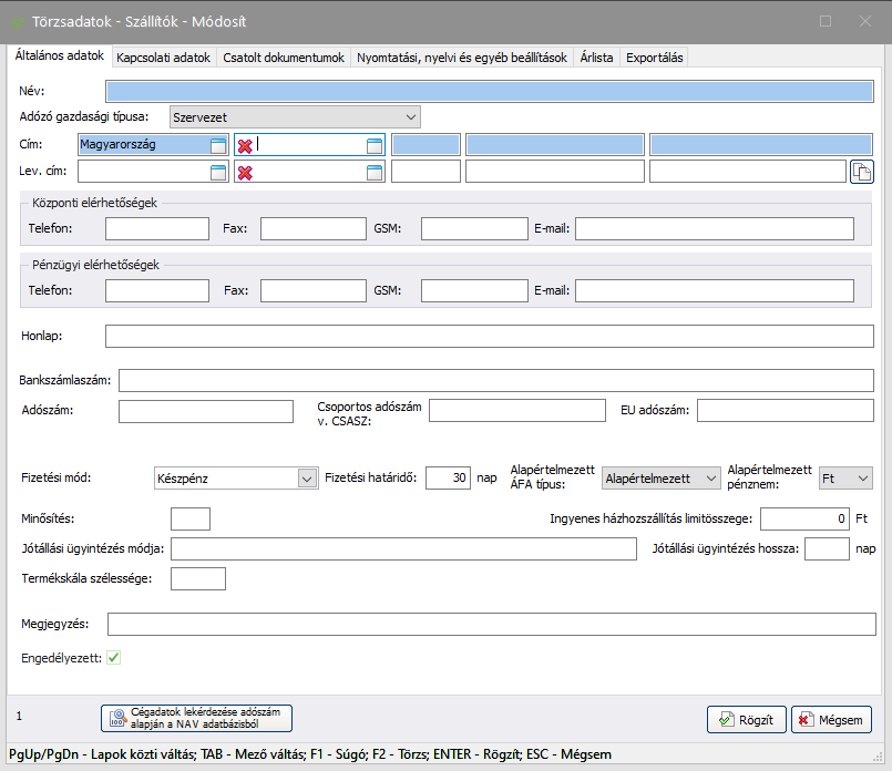 Új szállító létrehozásakor a megjelenő ablakban az alábbi fülekkel találkozhat: (ezeket alább részletesen bemutatjuk):