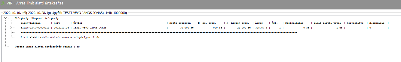 Elérése: Lekérdezések, listák -> Pénzügyi kimutatások -> Utókalkuláció -> Árrés limit alatti értékesítés