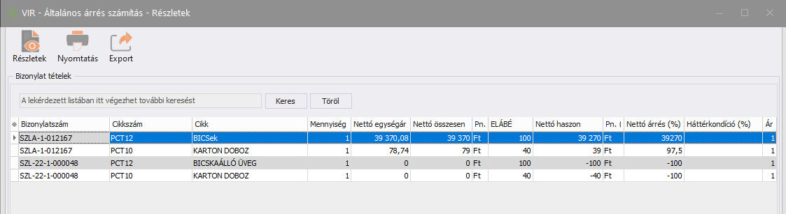 A lista nyomtatható, exportálható, valamint a sorok részletei a Részletek gombbal nézhetők meg.
