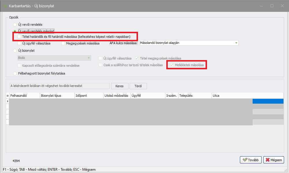 Amennyiben a Vevői rendelés karbantartóból Új Vevői rendelést kíván létrehozni, lehetőség van a tétel határidők másolására. Ha a paramétereknél aktív a Vállalási határidő kezelése, és a bizonylatnál meg vannak adva a tétel határidők, akkor azok átvihetők az új bizonylatra. Fontos! Ha a kelt napjánánál korábbiak a tétel határidők, a bizonylatot nem lehetséges rögzíteni!