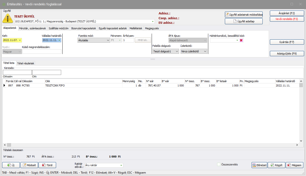 Új Vevői rendelés foglalással rögzítéséhez válassza az Értékesítés -> Vevői rendelés foglalással menüpontot!