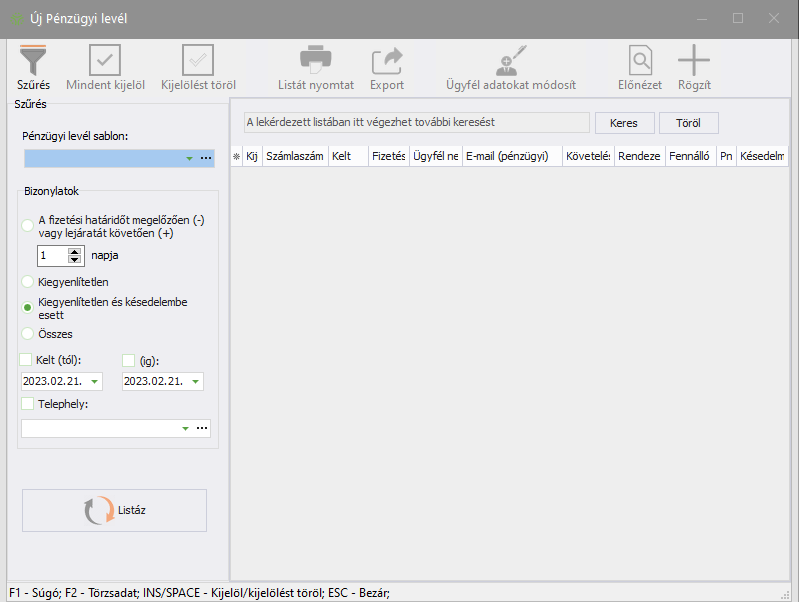 - Típus: nyomtatási formátum, két választható opciója a levél és a késedelmi kamatközlő. Utóbbi választása esetén a késedelmi kamatszámításnál a "nincs kamatszámítás, megjelenítés" opció nem választható