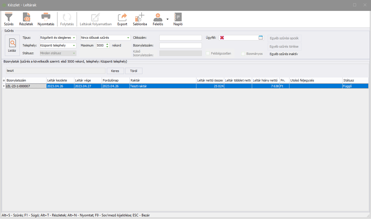 A leltár funkció ahhoz nyújt segítséget, hogy a program által nyilvántartott és a tényleges készletet összehasonlíthassa.