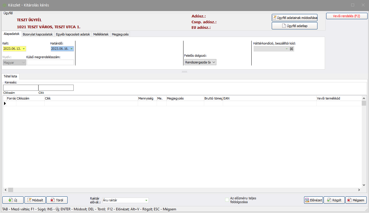 Ebben az ablakban van lehetősége a Kitárolás kérés típusú bizonylatok karbantartására.