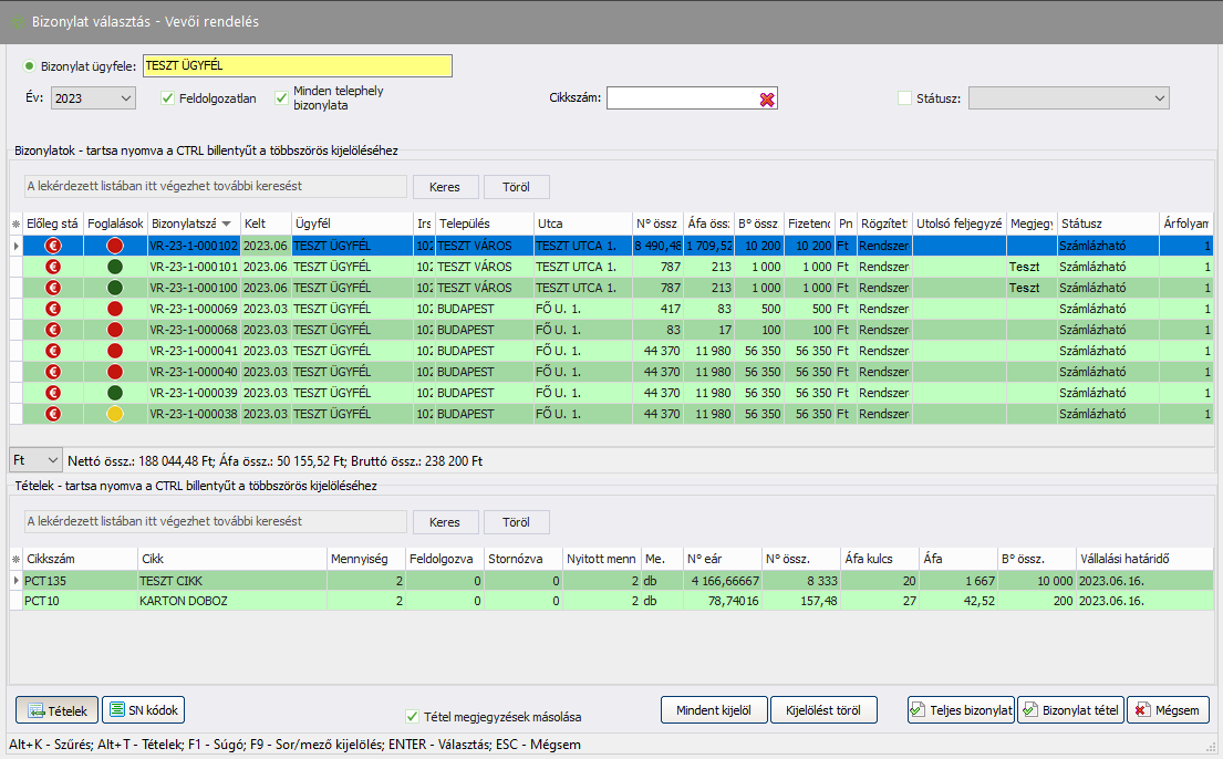 - Az ügyfél adatok részt a program automatikusan kitölti a kiválasztott vevő adataival.