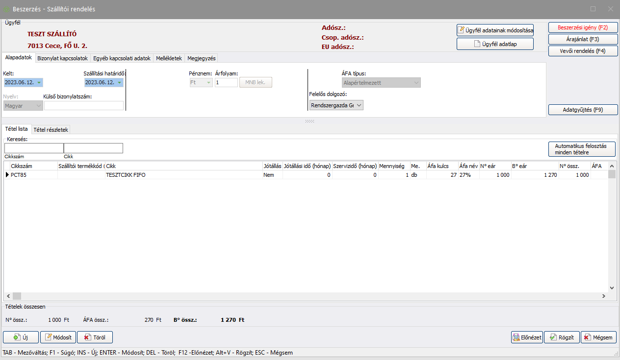 (Rögzít) gombbal tudja elmenteni a szállítói rendelés bizonylatot.