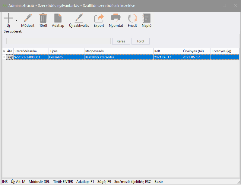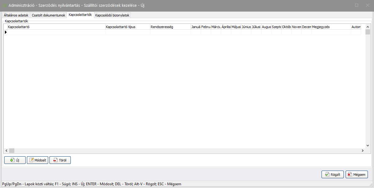 Elérése: Adminisztráció -> Szállítói szerződések kezelése -> (Új) gomb