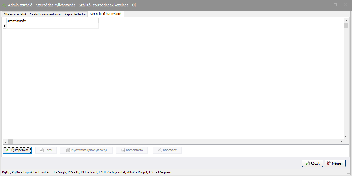 Ezen a felületen rögzíthetőek a szerződéshez kapcsolódó bizonylatok. A bizonylat ezen a felületen keresztül nem karbantartható, csak a kapcsolat ténye rögzül.