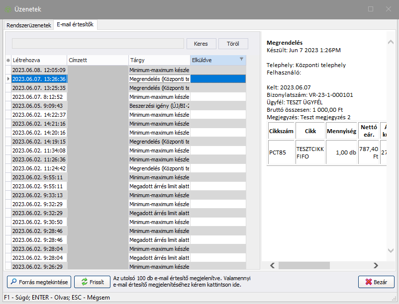 Ebben az ablakban a rendszer által automatikusan küldött e-mail értesítőket tudja visszaolvasni. (Az e-mail értesítők beállításáról részletesen az E-mail értesítők beállításai c. fejezetben olvashat!)