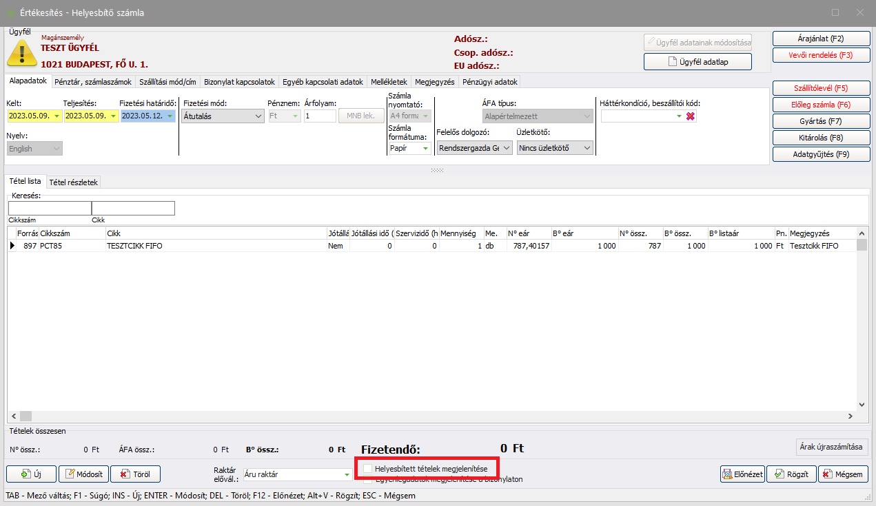 Mivel az ügyfél adatai a helyesbítő számlával nem javíthatók (ebben az esetben a sztornó számla, majd új számla készítése a megoldás), így a helyesbítő számlán az ügyfél adatai a helyesbített számlával megegyezően szerepelnek, a rendszer nem az ügyfél törzset veszi figyelembe.