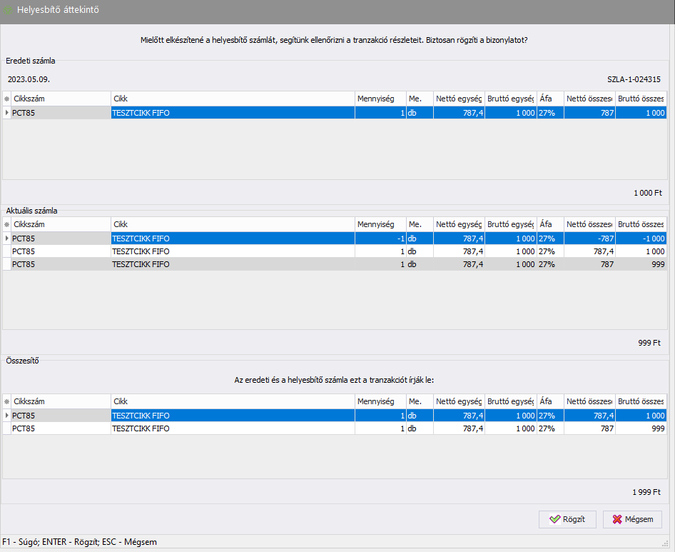 A helyesbített adatok megadását követően a (Rögzít) gombra kattintva a rendszer a bizonylat rögzítése előtt egy áttekintő ablakot jelenít meg, mely segítségével ellenőrizhető a helyesbítéssel előálló adattartalom.
