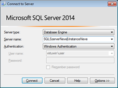 2. Adja meg a szerver elérhetőségét (név vagy IP cím, illetve named instance esetén az instance neve \ jellel elválasztva), bejelentkezési adatokat.