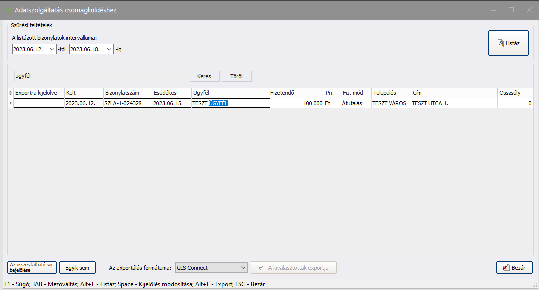 - A felső szűrési feltételekkel beállítható, hogy mely intervallumban kelt bizonylatok szerepeljenek a listában - és az exportban.