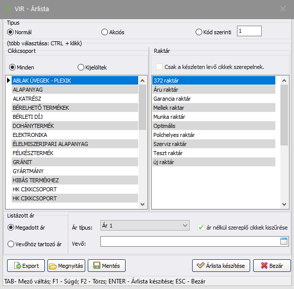 ár nélküli cikkek kiszűrése kapcsolót! Ekkor azok a cikkek, melyekhez nincs a fent megadott ár rögzítve, nem jelennek meg a listában. - Exportáláshoz használja az