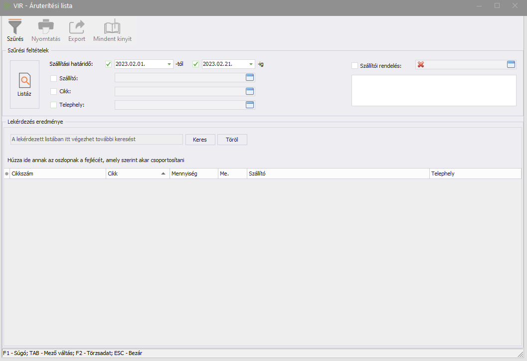 E menüpont segítségével készíthet egy listát arról, hogy a folyamatban lévő megrendelések alapján melyik telephelyre mely szállító milyen árucikkeket fog kiszállítani.