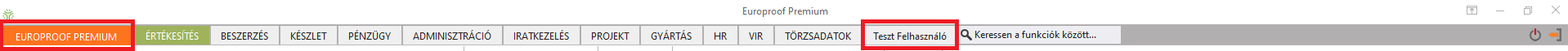 A műveleteket a főképernyőn a fő menüsor Europroof és/vagy Felhasználó név menüpontjainak segítségével hajthatja végre.
