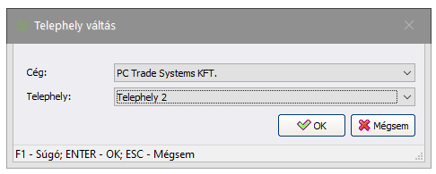 A menüpont segítségével a felhasználó egy másik telephelyre és cégre válthat anélkül, hogy ehhez újból ki és be kellene jelentkeznie. A menüpontra kattintva a telephelyek és cégek közül választhat egy új ablakban. Válassza ki a listából a kívánt telephelyet és céget, majd kattintson az OK gombra! Ezután a program automatikusan telephelyet és céget vált!