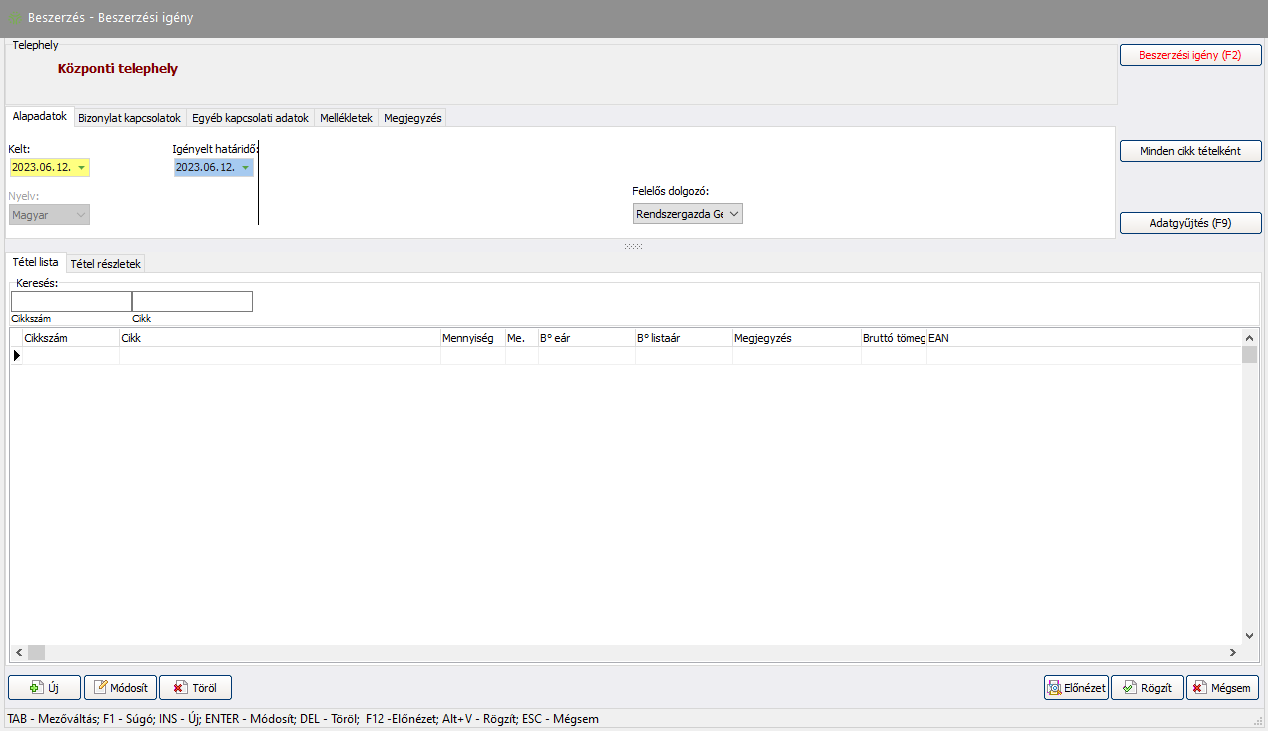 - Az Alapadatok fülön a bizonylat keltezési és az igényelt határidő dátuma található.