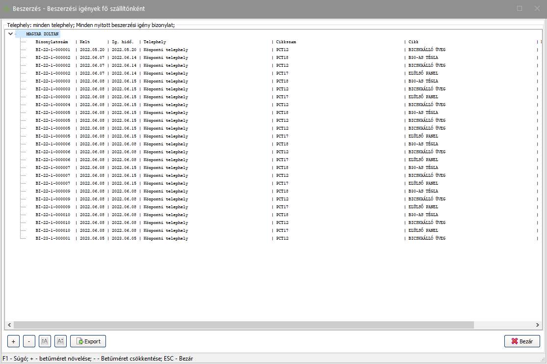 A lekérdezés eredményeképpen kapott listában látjuk a kiválasztott telephelyre vonatkozó beszerzési igényeket szállítónként csoportosítva.