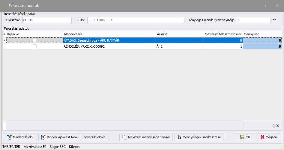 A Felosztási adatok gombbal oszthatja el a rendelendő mennyiséget a vevői rendelések, projektek között.