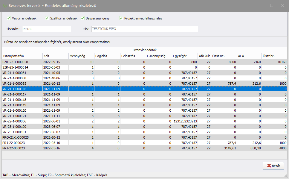 A Rendelés állomány részletezése gombbal megtekinthetők az adott cikkre vonatkozó részletes adatok: