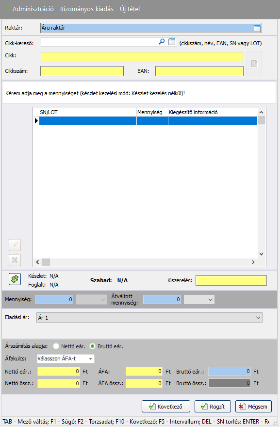 mezőben megjelenik a kiválasztott SN/LOT kódos termékek száma, automatikusan kitöltődnek az árak mezői a megfelelő értékekkel. - Hagyja ki a következő lépést, és folytassa a 9. ponttól a műveletsort!