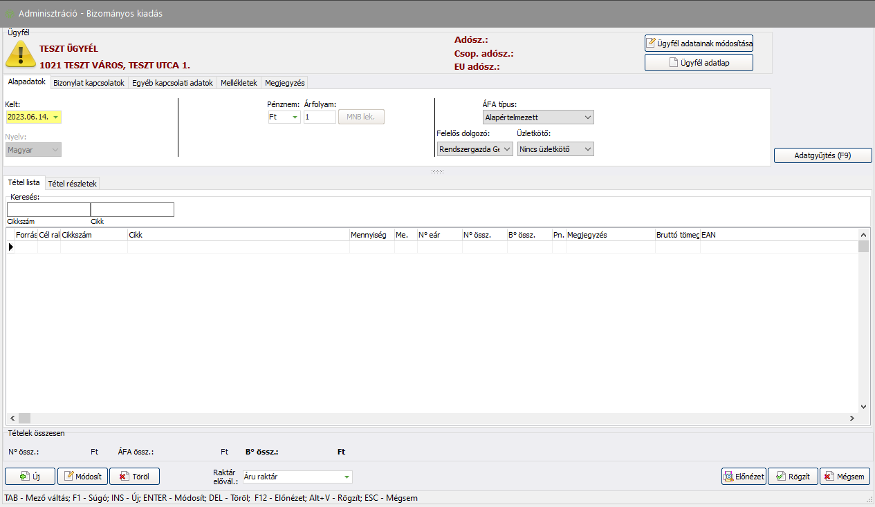 - Ha megadott minden szükséges adatot a fenti fülek segítségével, következhet a tételek hozzáadása a bizonylathoz.