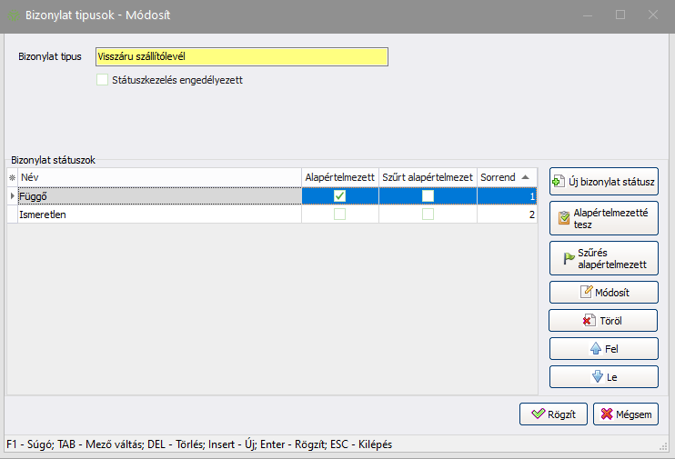 Figyelem! Amennyiben egy meglévő státusz nevét módosítja, a rendszerben már meglévő bizonylatok esetében is módosulni fog a név!