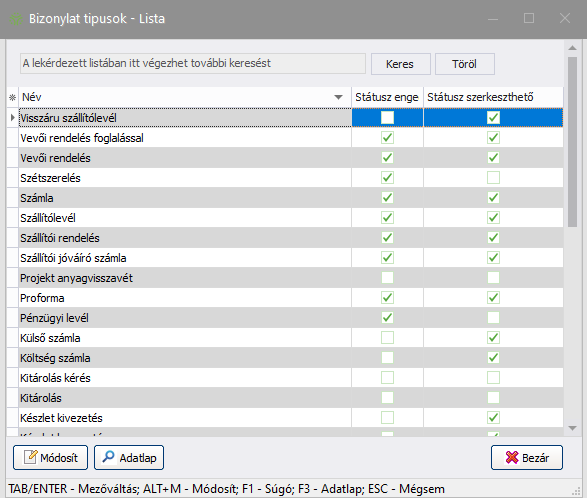A menüpont segítségével lehetőség van beállítani a rendszerben, hogy mely típusú bizonylatok esetében legyen a bizonylatstáusz módosítható, szűrhető. Vannak olyan bizonylattípusok, melyek esetében nem lehetséges státuszváltásokat kezelni, ezen bizonylatoknál a rendszerben automatikusan végbemenő státuszváltások történnek. Ilyenek tipikusan a gyártáshoz tartozó bizonylattípusok.