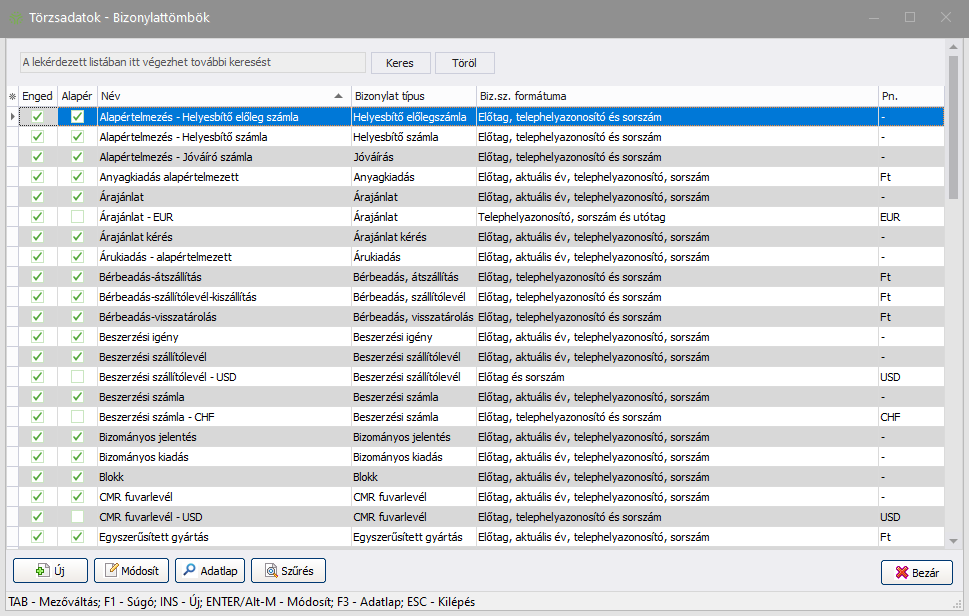 Elérése: Törzsadatok -> Bizonylat tömbök