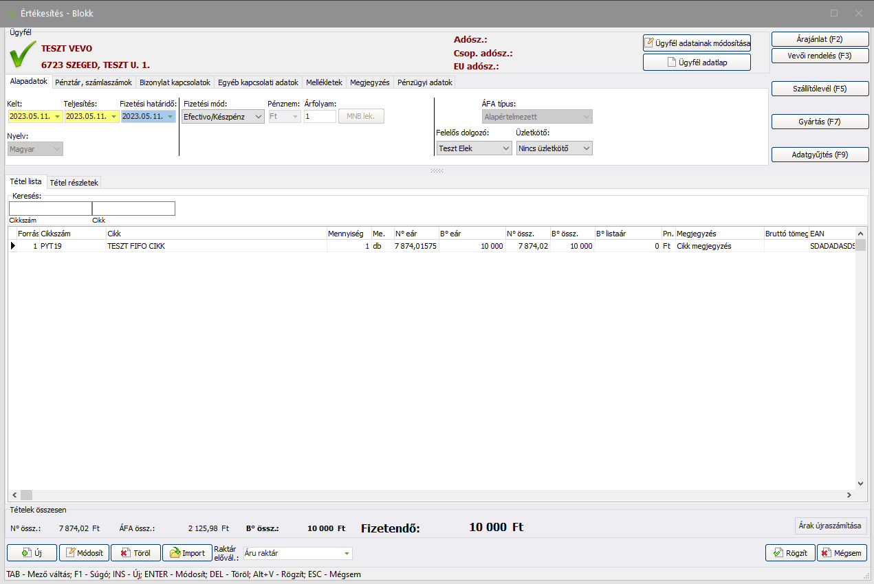 (Rögzít) gombra. A tétel adatlapja bezáródik, majd a bizonylat Tétel listájára felkerül az adott tétel. További tételek hozzáadásához ismételje meg a fenti műveletsort. A folyamatos tételrögzítésre a