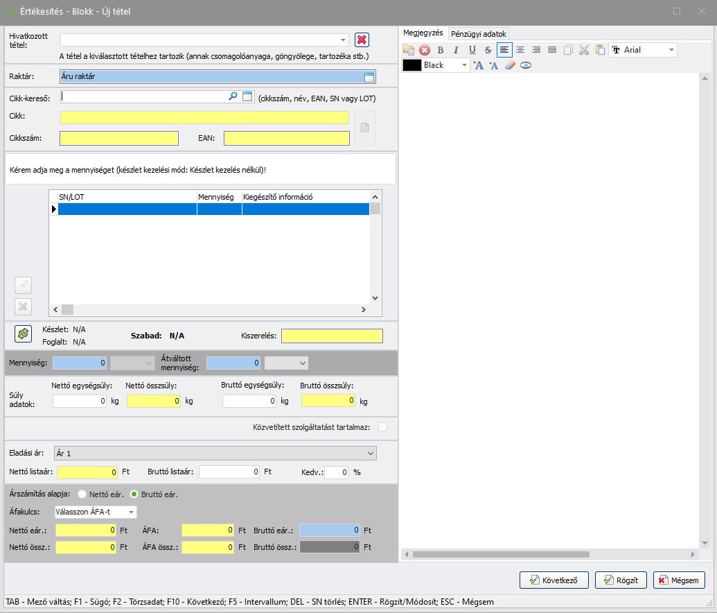 mezőbe a cikkhez tartozó megjegyzést. Ez a megjegyzés a nyomtatott számlán közvetlenül az adott tétel alatt jelenik meg. - Ha szeretné rögzíteni a tételt, kattintson a