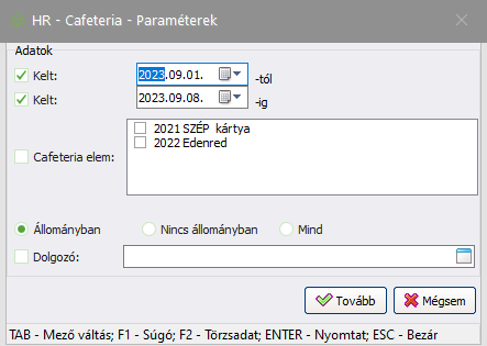 Kiválasztása esetén a mező kötelezően kitöltendő! A szomszédos mezőben ekkor kapcsolók segítségével adhatja meg, hogy melyik cafeteria elemet/elemeket listázza a rendszer. A lista elemei a HR modulban rögzített cafeteria elem. (Alapértelmezetten a lista üres.)  |