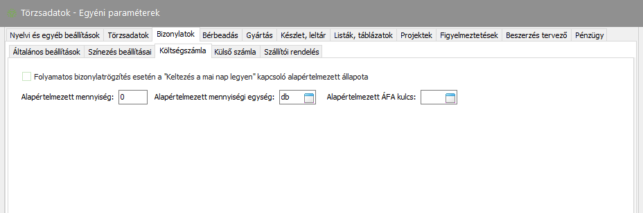 Elérése: Törzsadatok -> Egyéni paraméterek -> Bizonylatok (fül) -> Költségszámla (fül) vagy