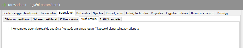 Elérése: Törzsadatok -> Egyéni paraméterek -> Bizonylatok (fül) -> Külső számla (fül) vagy
