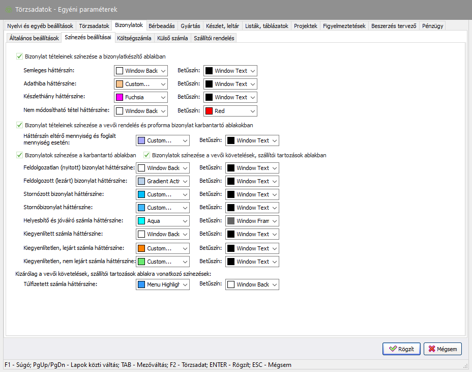 Elérése: Törzsadatok -> Egyéni paraméterek -> Bizonylatok (fül) -> Színezés beállításai (fül) vagy