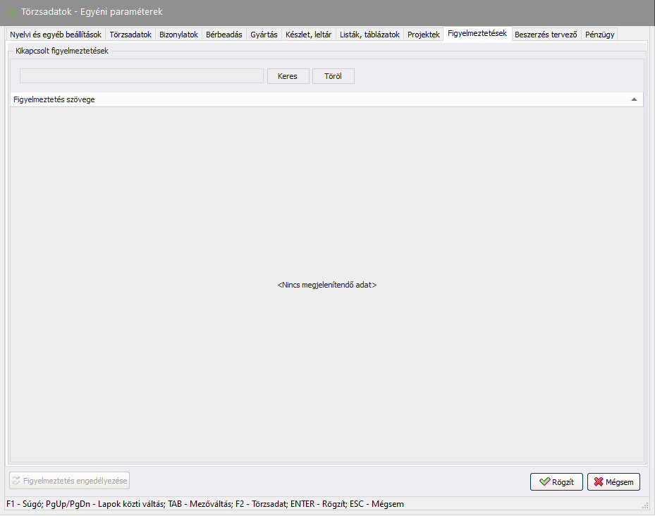 Elérése: Törzsadatok -> Egyéni paraméterek -> Figyelmeztetések (fül)