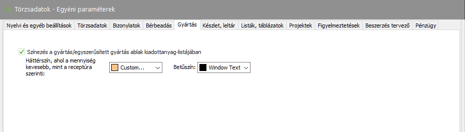 Elérése: Törzsadatok -> Egyéni paraméterek -> Gyártás (fül) vagy
