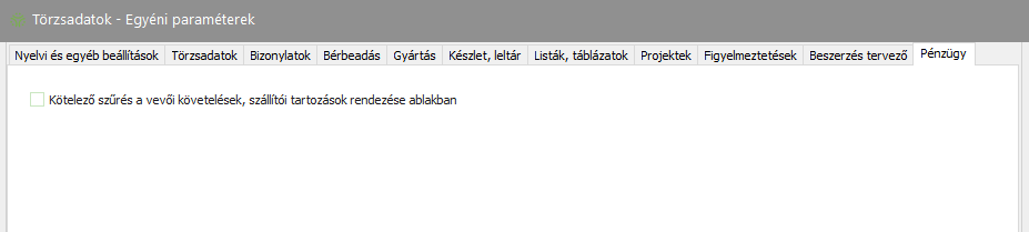 Elérése: Törzsadatok -> Egyéni paraméterek -> Pénzügy (fül) vagy