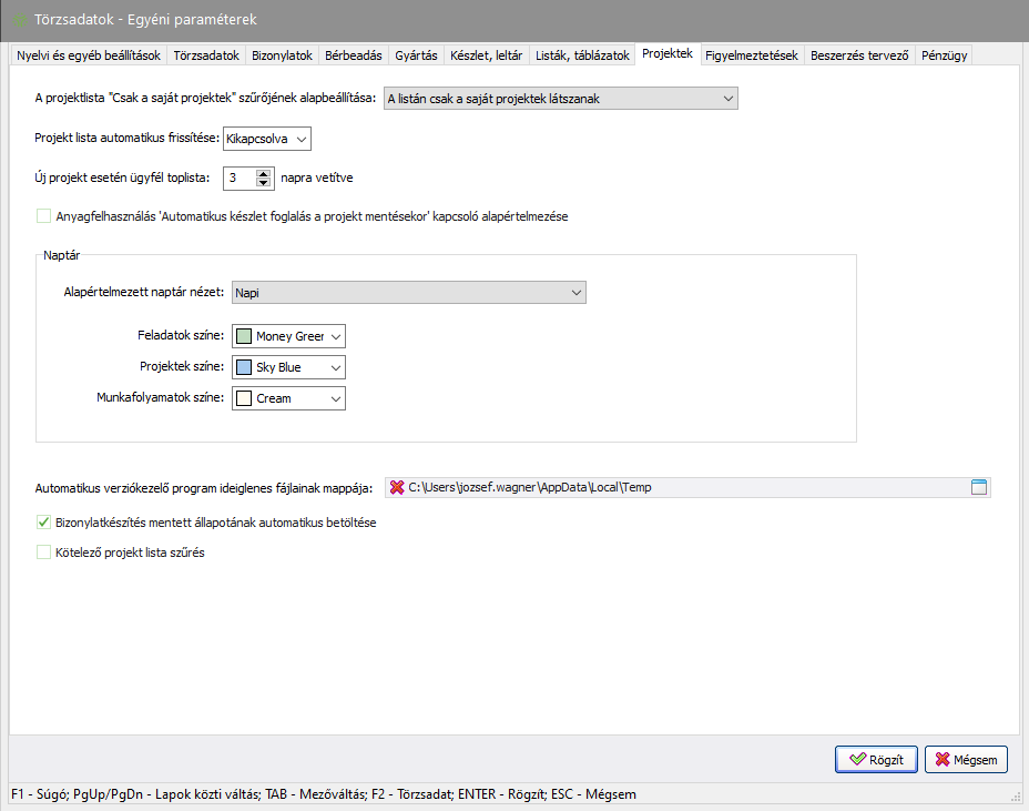 Felhasználó név -> Egyéni paraméterek -> Projektek (fül) vagy