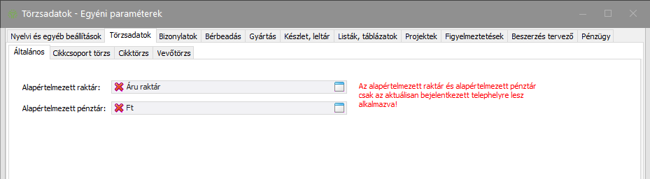 Az Alapértelmezett raktár megadásával a bejelentkezett felhasználó bejelentkezett telephelyén lehet meghatározni, hogy a rendszer a raktárválasztások esetében mely raktárat készítse be alapértelmezettként. Valamint az itt megadott raktár készletét jeleníti meg a Törzsadatok -> Cikk törzs menüpontban a cikklista, amennyiben nincs bejelölve a Minden raktár összesített készletének megjelenítése a cikktörzsben opció. (Erről bővebben az Egyéni paraméterek -> Cikktörzs c. részben olvashat.)