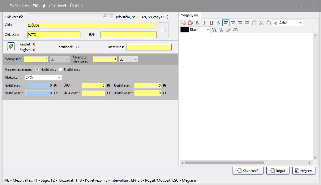 mezőbe a cikkhez (előleghez) tartozó megjegyzést.