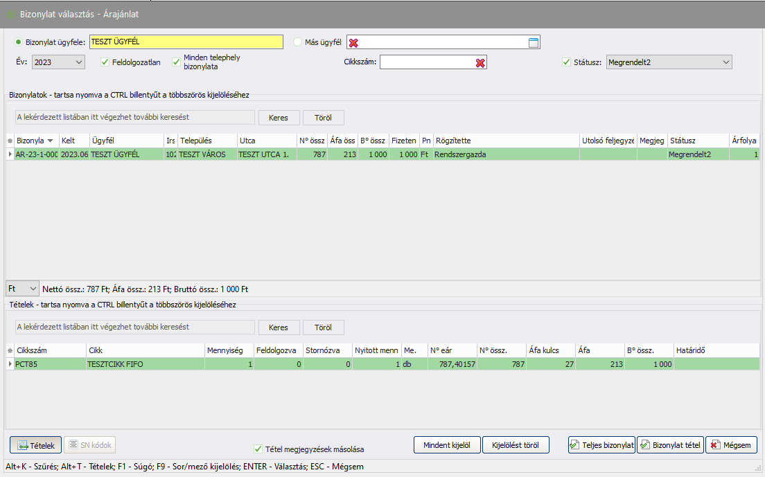 - Válassza ki a megfelelő előzménybizonylatot, és illessze be a bizonylattörzsbe a megfelelő tételeket! (Bővebben a Bizonylatkészítés előzménybizonylat alapján c. fejezetben.)