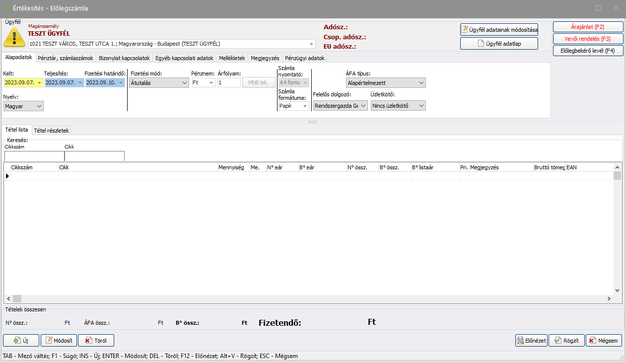 Belföldi jogi személynek kiállított előlegszámla nem rögzíthető addig, amíg a vevőhöz az adószám vagy a CSASZ nincs megadva.