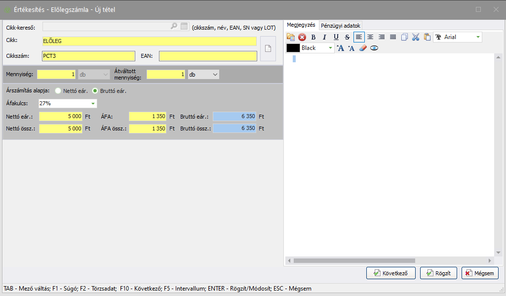 mezőbe a cikkhez (előleghez) tartozó megjegyzést.