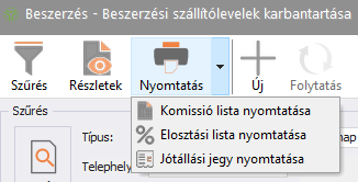 A Beszerzési szállítólevelek és Beszerzési számlák karbantartása menüpontból érhető el. A nyomtatási listában kiválasztva az elosztási adatok nyomtathatók ki a kiválasztott bizonylat vonatkozásában.