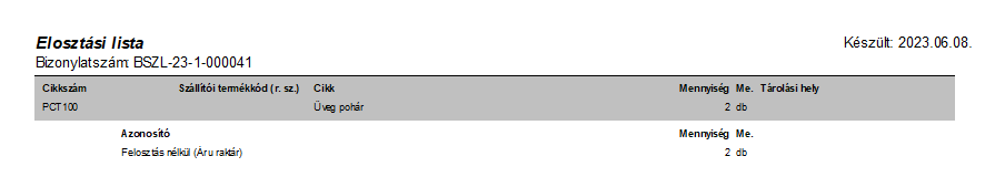 Egy bizonylat tételeinek telephelyekre felosztott mennyiségeinek nyomtatása. Segítségével könnyedén átlátható, hogy a kézhez kapott termékek közül mely tételekből mekkora mennyiség kerüljön át az egyes telephelyekre.