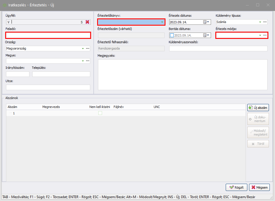 Fontos! Alszám nélkül nem lehetséges érkeztetés rögzítése, de a program automatikusan létrehoz egy üres alszámot.Amennyiben szükséges, módosíthatja ezen alszámot!