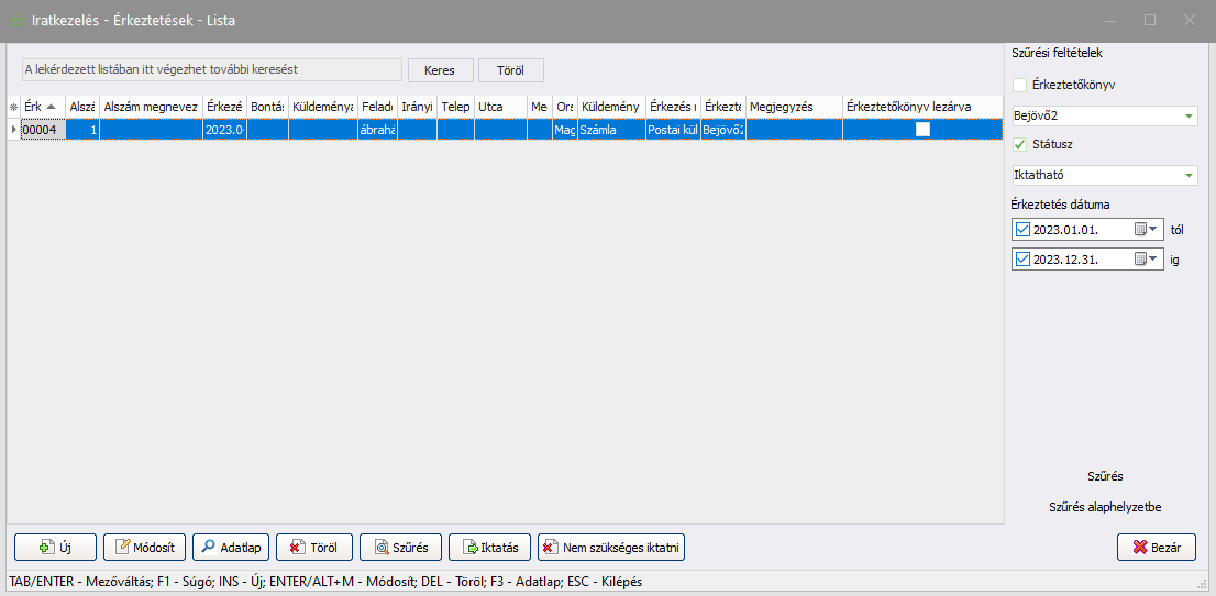 (Módosít): a kijelölt érkeztetés adatainak módosítása